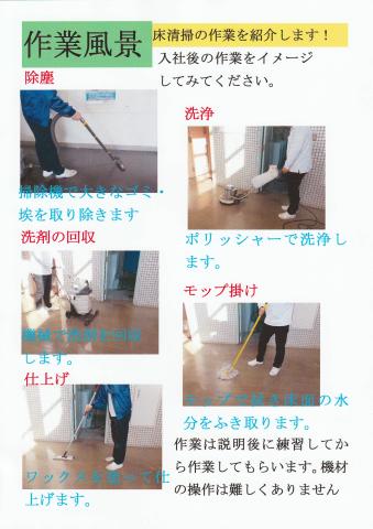| 職種 | 清掃 請負先の建物の主に床の洗浄からワックスがけを行います。 未経験者にも丁寧に指導いたします。 |