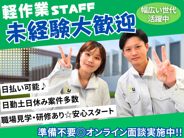 未経験OKの軽作業や、フォークリフト資格取得支援がある業務など、幅広いお仕事をご用意しております!