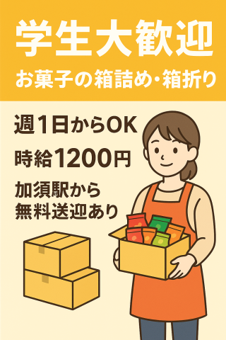 | 仕事内容 | ・お菓子の箱詰め ・箱作り ・梱包作業 |