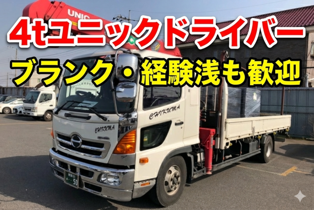 | 仕事内容 | 4tユニック車を使用した建設資材などの配送業務です。 エリア:関東一円(埼玉・東京・神奈川・千葉)の地場配送のみ 件数:1日1〜2件程度 作業:積み降ろしはフォークリフトやユニックを使用(手積み手降ろしは基本ありません) 「トラックには乗れるけどクレーン操作は初めて」という方も安心してください。 資格取得支援制度を活用して働きながらスキルを身につけられます。 将来的に大型車両へステップアップしたい意欲のある方も応援します! |