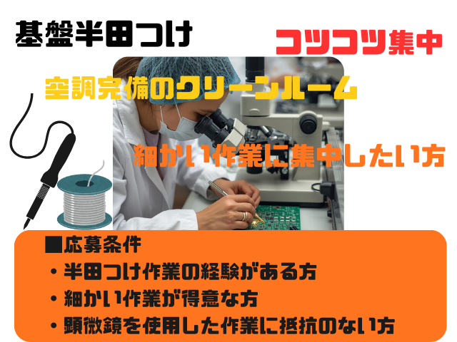 | 応募資格・経験 | ・半田付け作業の実務経験がある方 ・細かい作業が得意な方 ・顕微鏡を使用した作業に抵抗のない方 |