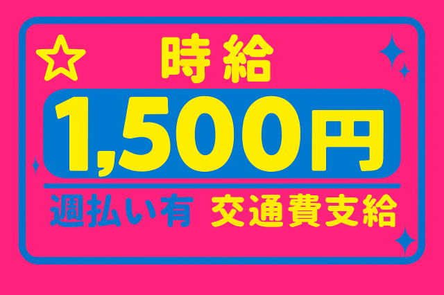 | 給与 | 時給1500円 交通費:一部支給 ※規定あり ◆交通費一部支給 ◆残業手当あり ◆深夜手当あり ◆週払いOK ※当社規定による |