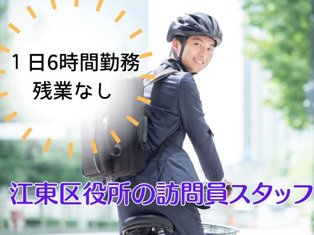 | 交通アクセス | ■東京メトロ東西線 「東陽町」より徒歩5分 *駅近5分以内 訪問手段:電動自転車を使用します! 江東区役所庁舎内に事務所(センター)があります。 センターから訪問先に出向き、訪問後はセンターに戻ります。 ◎浦安、西船橋などの千葉方面から通っているスタッフさんもいます! |