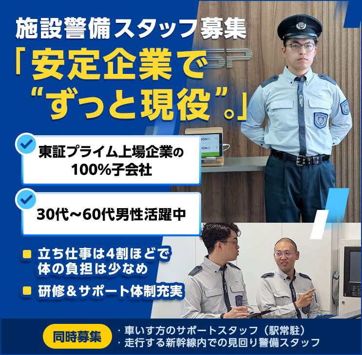 | 備考 | ‥‥先輩スタッフの声(22歳/入社11ヶ月)‥‥ ◆応募のきっかけ 駅ビルや駅での仕事が多く、安定していると感じました。 親会社が東証プライム上場企業という点も、 安心して働けると思った理由のひとつです。 ◆入社前後のギャップ 警備に対して“立ちっぱなしでキツい”というイメージがありました。 説明会で確認すると、実際には立ちっぱなしの業務はそれほど多くないとのこと。 入社してみると本当にその通りでした。 座っての受付や監視が多めなので、体への負担は少ないです。 ◆未経験からスタートしてみての率直な感想 慣れるまでにかかった期間は2ヶ月ほど。 職場の先輩方が優しく丁寧に教えてくれました。 人によってやり方が違うので吸収するのは少し大変でしたが、 それぞれの良いところを自分なりに取り入れました。 ◆応募を検討中の方へ 拾得物の対応や傷病者対応で感謝の言葉をいただける瞬間はとても嬉しいものです。 目配り・気配りを意識できれば、未経験でも必ず活躍できますよ! \この会社の良いところ/ *休みが取りやすい&シフトも比較的融通がきく 「資格の勉強など自分の時間が作れます」 *独身寮あり 「地方からの上京組なので、すごくありがたかったです!」 *資格手当あり 「頑張りが給与に反映されるので、モチベーションも上がります」 |