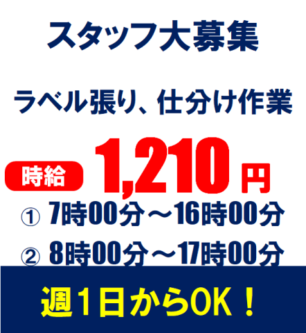 | 仕事内容 | 商品にラベルを張り、パレットに積み重ねる作業 簡単な作業なので未経験者も大歓迎☆ |