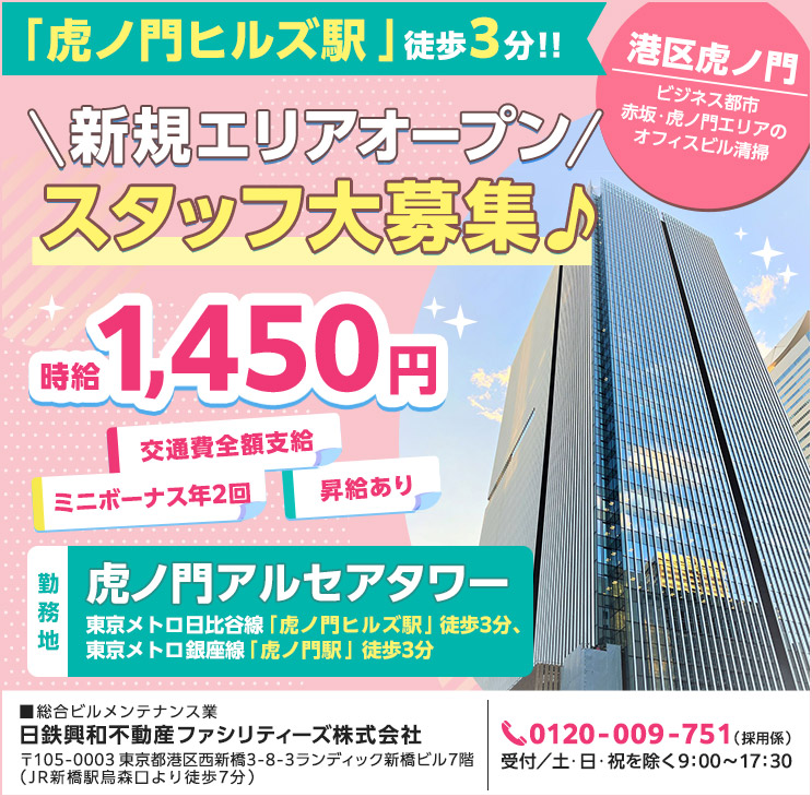 虎ノ門ヒルズ駅徒歩3分 平日7時からの短時間 オフィスビル清掃 /未経験歓迎!