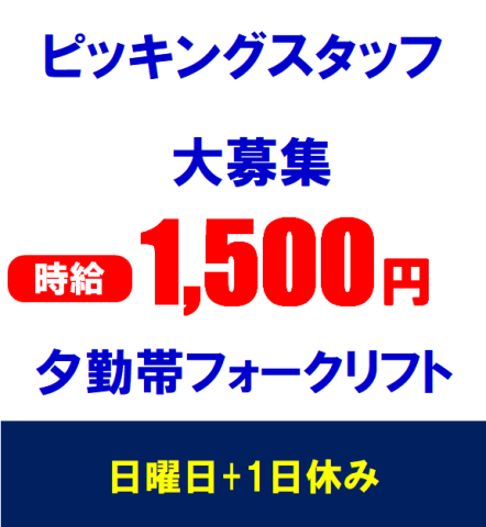 | 仕事内容 | フォークリフトに乗務して庫内入出荷業務 |