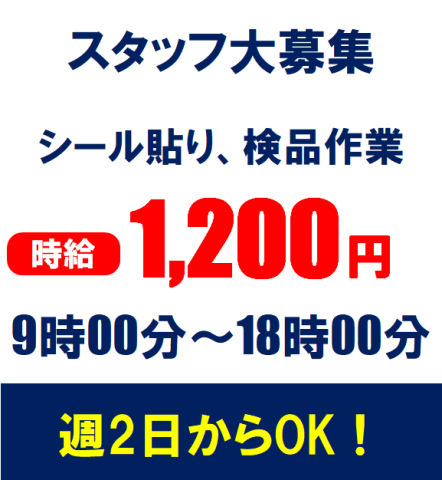 | 仕事内容 | 医薬品のシール貼り、箱詰め、検品作業 |
