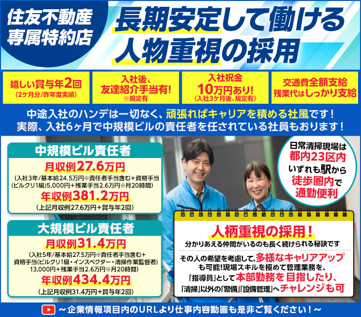 | 給与 | [1]責任者候補 月給23万円〜 ※責任者となった場合、月給24.5万円〜(担当規模・役割により段階的に昇給 月収例26.1万円(入社2年/基本給23万円+資格手当5,000円+残業手当2.6万円※月20時間) 年収例360.2万円(上記月収例26.1万円+賞与年2回) [2]日常清掃 月給22万円〜 月収例24.6万円(入社1年/未経験/基本給22万円+残業手当2.6万円※月20時間) 年収例339.2万円(上記月収例24.6万円+賞与年2回) ※残業代はしっかり支給いたします |