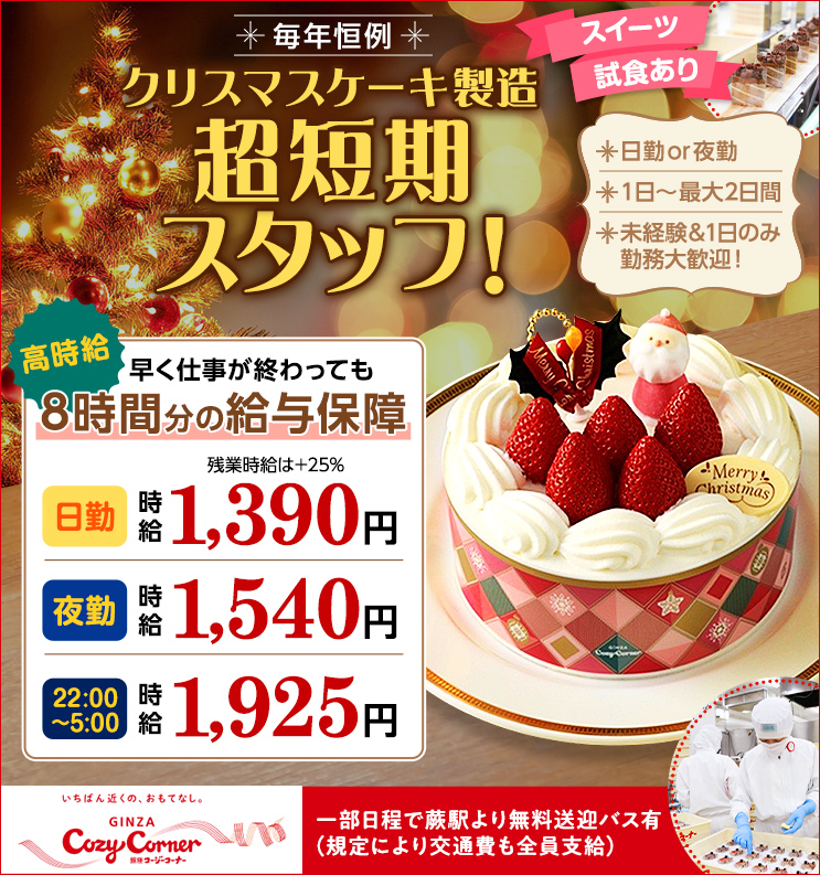 | 仕事内容 | ★クリスマスケーキの製造及び関連業務★ <銀座コージーコーナー 川口工場>でのお仕事です♪ 生クリーム供給部門・デコレーション部門・梱包部門など色々な部署に分かれています。 割り振られた担当を繰り返して作業を行います。 基本的にはどの仕事も流れ作業、繰り返し行うので、 初めての人でも慣れていきやすく、作業しやすいですよ! ※定員になり次第受付終了となりますのでご了承ください。 |