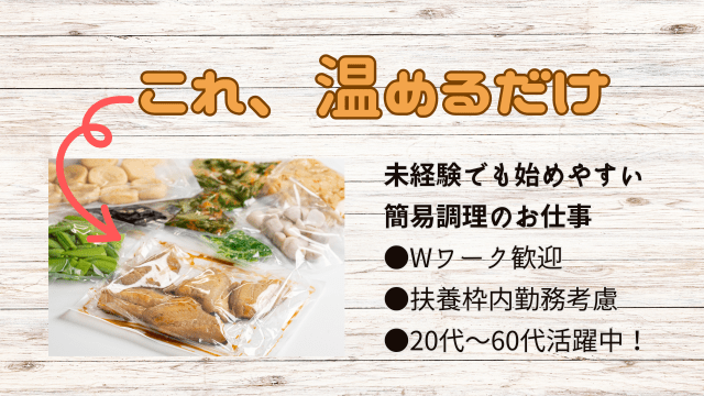ひとり作業なので、厨房経験者にはうってつけ!!惣菜を湯煎・盛付・配膳!!