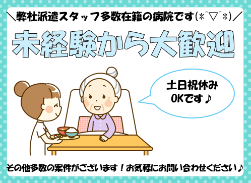 | 応募資格・経験 | ■資格、経験不問 ■ブランク有り歓迎 ■20代〜50代・60代の方まで幅広い年代の方が活躍中 ※入社後に研修があります(1週間・時給等同条件) 看護補助とはどのようなお仕事なのか まずは座学で学んでいただいてから、 病棟にて実際の業務を見ていただきますので 未経験でも安心してスタートすることができます♪ ※資格支援制度有り |