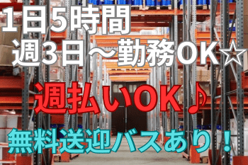 扶養内/時短勤務/週3勤務/週払い/年間休日126日/土日祝休/無料送迎バス/交通費支給/制服貸出
