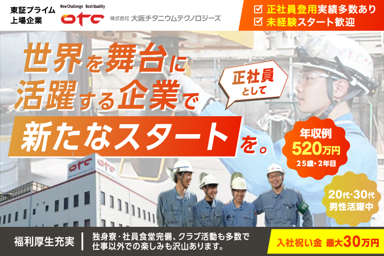 | 応募方法 | 「応募する」ボタンよりWEBエントリーの上、 履歴書をお送りください。 ご応募いただきましたら、書類選考の上 お電話(06-6413-4300)にて選考のご案内いたします。 ◎選考の流れ WEBエントリー ↓ 履歴書送付 ★職務経歴書は不要! ・メール(データ送付もしくは手書きのものを写メでもOK) ・郵送 ↓ 書類選考(履歴書到着後、2〜3日) ↓ 面接日程のご案内 ↓ 面接(1回のみ) ・対面:会社説明+面接+試験+工場見学(約2h程度) ・オンライン:事前試験+会社説明+面接(約1h程度※事前試験除く) ↓ 採用 【履歴書郵送先】 〒660-8533 兵庫県尼崎市東浜町1番地 株式会社大阪チタニウムテクノロジーズ 採用担当宛 ★ご質問等のお問い合わせもお気軽にお電話下さい! ★オンラインでの面接もOK ★入社日毎月1日。入社月は相談に応じますので、お気軽に仰ってください。 |
