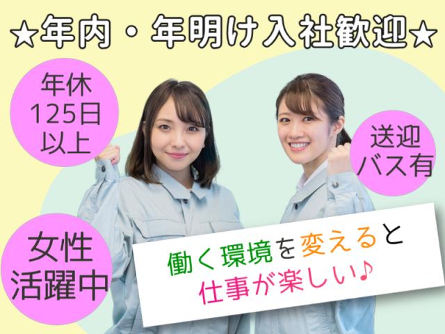 | 待遇 | *〜働きやすい環境〜* ・教育、フォロー体制抜群♪ ・ゆったり休める食堂あり ・送迎バスあり&車通勤OK ・受動喫煙対策済(屋外喫煙所あり) *〜馴染みやすい職場〜* ・未経験者が活躍中!女性多めの職場 ・コミュニケーション活発 ・質問もしやすい環境 ・体育会系ではなく落ち着いた雰囲気 ■各種社会保険完備 ■昇給制度あり ■残業手当別途支給 ■交通費支給(全額) ■入院保険加入済み(自己負担なし) ■退職金制度あり(入社3年目以降) ■インフルエンザ予防接種補助 ■ストレスチェック、健康診断(年1回) ■作業服・その他備品貸与 ■正社員・転勤なし |