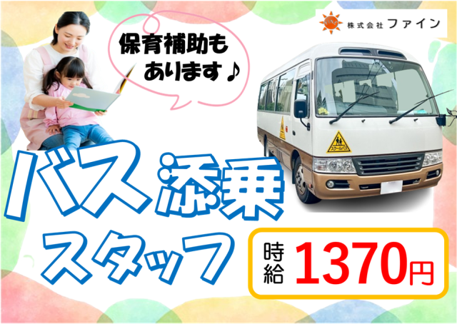 | 仕事内容 | 【幼稚園でのバス添乗業務】 通園バスの添乗業務をお願いします☆ ▼お仕事内容 ・乗降時の安全見守りや 人数のチェック ・走行時の安全指導や シートベルト着用などの指示 ・保護者との挨拶など ☆日によって保育補助業務を お願いすることもあります! \ここがポイント/ ◆無資格OK ◆土日祝休み ◆残業なし _____________ \ここが嬉しい/ ●園見学時、同行します! ●新年度からのお仕事 ●時給1370円+交通費支給 ●有給制度あり . 株式会社ステップグランドスタッフは2月より 株式会社ファインとして新しくスタートしました♪ |