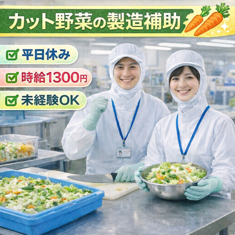 | 仕事内容 | カット野菜の工場でのお仕事♪ 具体的には・・・ ●包丁で野菜の芯を落とす ●機械にセットしてスライスする ●カット後の野菜を洗浄機に移す ●野菜を包装機に入れる など カンタン作業ばかり♪ 味付けをしたり、 難しい調理技術などは一切不要です◎ 「残業もしてしっかり稼ぎたい・・」 「平日にお休みがほしい」 そんな方にオススメのお仕事です◎ まずはお気軽にお問い合わせくださいね♪ |