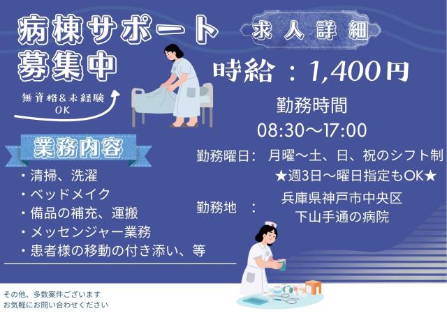 【神戸市中央区/時給1,400円】備品補充や清掃・洗濯メインの看護助手/介助業務一切なし!