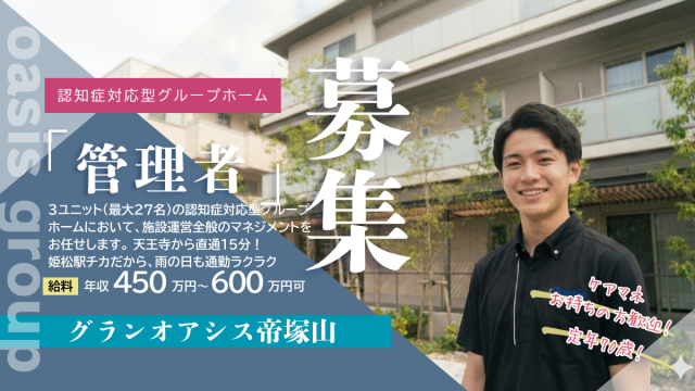 | 応募資格・経験 | 【必須】 認知症高齢者の介護従事経験:3年以上 認知症対応型グループホームの管理者経験 自動車運転免許 歓迎:介護支援専門員・認知症介護実践者研修・認知症対応型サービス事業管理者研修 |