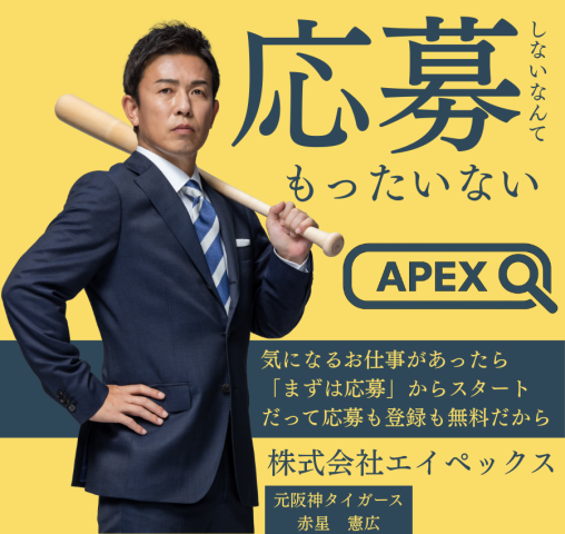 | 応募方法 | 「応募する」ボタンをご利用下さい (電話での受付は現在停止中) 【応募のご案内】 2点のご対応お願い致します。 ご登録の簡易説明(図解) https://drive.google.com/file/d/1tUGS9mYigihaa1Ze85ArWyugpjn9MONH/view?usp=drivesdk 【1点目】履歴書をメールで送付ください (職務経歴書も必要な場合あり) メール:apex@mail-apex-group.co.jp ※写真可 【2点目】以下のURLからアンケート回答をお願いします。 https://forms.gle/5cHCt6H9q7FpbvCd9 【ご案内詳細(画像)】 https://drive.google.com/file/d/1fxJJRk_IzKyYSdaSKHmrsolbpwLG-0f_/view?usp=drivesdk 見学後にお仕事をご辞退いただいても構いません。 エイペックスは地域貢献を目標に滋賀県を中心に事業を展開しています。 スポーツ(野球、サッカーなど)の振興にも力を入れていきたいと思っており ホームページやInstagramには元阪神タイガースの赤星憲広が登場しています。 |