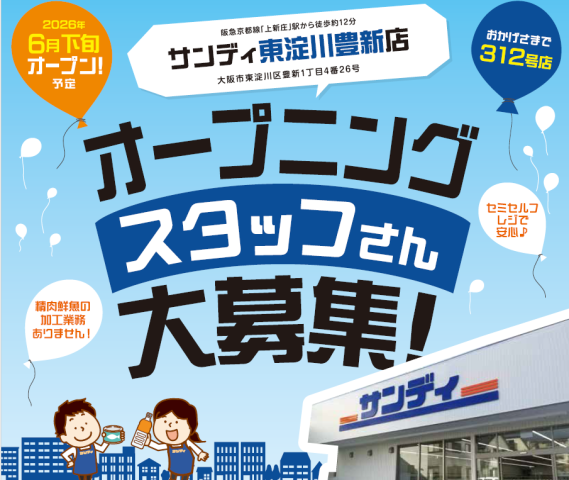★6月下旬オープン予定★サンディ東淀川豊新店★【スーパーのセミセルフレジ・早朝品出しSTAFF】