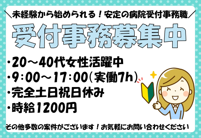 ☆未経験でも事務デビューOK!【土日祝休み】病院内の受付事務のお仕事♪