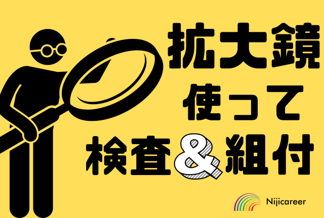 仕事内容 | 【作業内容】 自動車用 照明器具の【検査】【組立】を お願いします。 (1)検査する箱をまずはハンディで 製品を読み取り、モニターに反映させます。 (2)組付る前の製品をまずは拡大鏡で 傷や欠け、凹みがないかを確認します。 (3)問題のない部品を治具の上にのせ モニターの指示に従い組付していきます。 (4)出来上がった製品のデーターを入力するだけ ※難しい作業はありません ※自分のペースでできるお仕事です! ※基本はモニターに指示がでるので コミュニケーションが苦手な方にもおすすめです。 |
