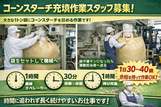 | 仕事内容 | 食品加工をしている工場での以下の業務です。 コーンスターチを専用の袋に入れる工程のオペレーターをお任せします。 ※コーンスターチとはトウモロコシを原料とした粉末のことです。 ①機械に専用の袋をセット(1トン用の袋) ②開始ボタンを押す、などの機械操作 ③コーンスターチが袋に溜まったら、運搬作業者に受け渡す その後、①に戻る 上記作業以外にも、 ・機械の点検 ・清掃 等の付随する業務もあります。 勤務時間中に1トン用の袋を30〜40袋、包装します。 1袋終わるのに5分程かかります。 1日中動き回る仕事ではなく、待機時間も都度あるため、メリハリ良く働くことができます。 ★仕事のイメージ 1時間:機械オペレーター 30分:待機(製品が準備できるまで) 1時間:機械オペレーター 30分:待機、掃除 時間に追われる働き方ではなく、余裕をもって働きたい方におすすめ! |