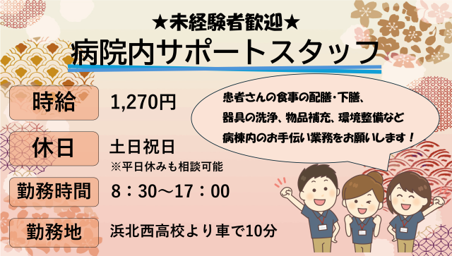 | 仕事内容 | 〜病院ワーク始めてみませんか!?〜 浜松市浜名区の療養型病院内にて 患者さんのお食事の配膳・下膳、 器具の洗浄、環境整備、物品補充、 その他病棟内でのサポート業務をお願いします。 ※療養型病院のため、長期入院の患者さんが多いです。 【無資格・未経験大歓迎 (*^▽^*)☆】 はじめは皆さん0からのスタート! 1人きりではなく、先輩から教わりながら進めていきますので、未経験でも必ずできるようになるお仕事です! 中には慣れるまで大変な業務もありますが、 とてもやりがいのある、感謝し感謝されるお仕事です! また、専属コーディネーターが付きますので、 困ったことがあればお気軽に相談していただけます (^^♪ ハローワークでお仕事を探されている方にもおすすめ! 少しでも気になった方は是非お問合せ下さい! |