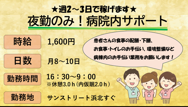 | 仕事内容 | *・病院ワークデビューしてみませんか?・* 浜松市内の療養型病院内でお食事の配膳下膳、 清掃、物品補充やシーツ交換など、 その他患者さんの身の回りのお世話をお願い致します。 夕方からですので入浴介助はありません。 無資格・未経験大歓迎 (*^▽^*)! 前職は工場勤務や飲食店、接客、事務など 異業種から活躍中のスタッフも多数! 日勤のみ経験者の方も夜勤専従で効率よく稼げます! ハローワークでお仕事探されている方もおすすめ! 少しでも気になった方は是非お問合せ下さい! |