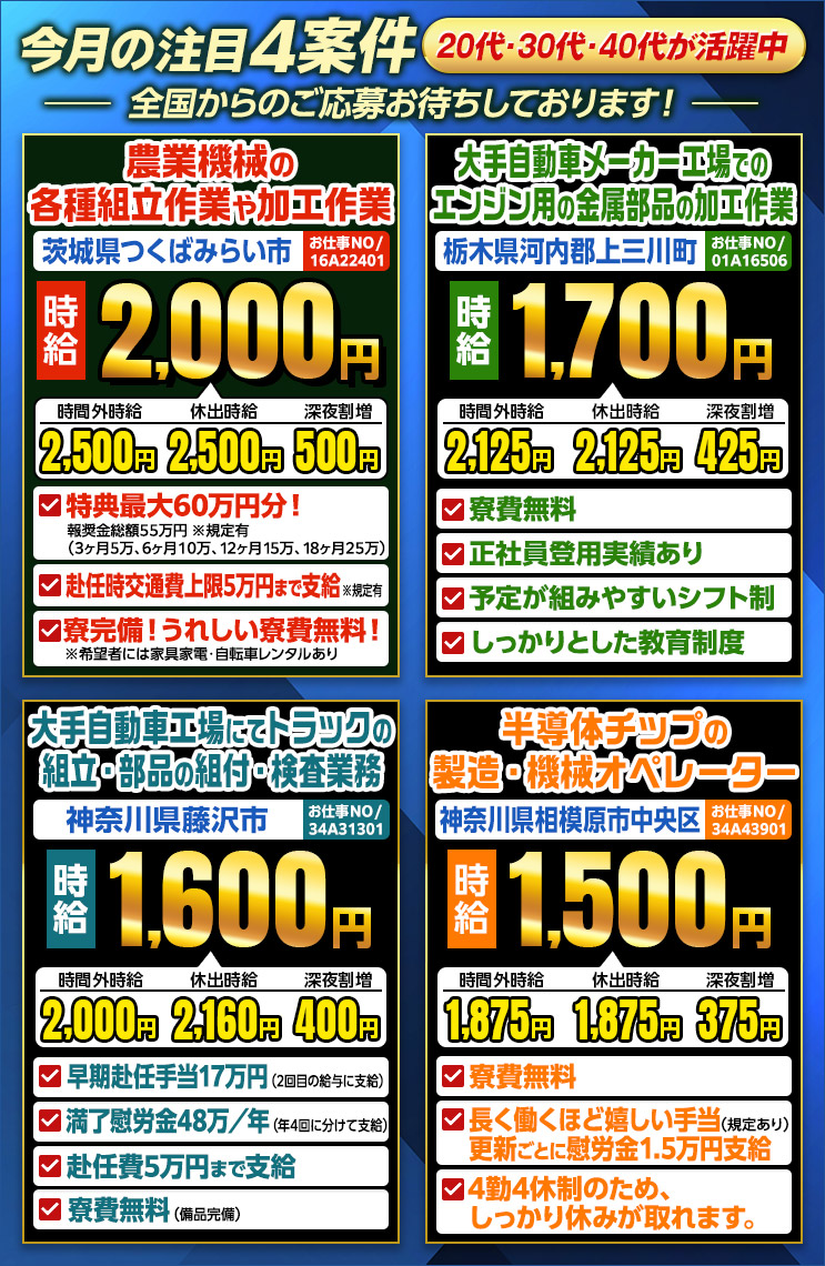 | 職種 | [1]トラクタ等の農業機械の各種組立作業や加工作業 [2]大手自動車メーカー工場でのエンジン用の金属部品の加工作業 [3]大手自動車工場にてトラックの組立・部品の組付・検査業務 [4]半導体チップの製造・機械オペレーター |