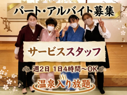 | 待遇 | ◆社会保険完備 ◆時短勤務制度 ◆マイカー・バイク通勤可 ◆健康診断費支給 ◆勤務前後の施設利用可(温泉) ◆制服貸与 <その他> 県外からの応募者の方には交通費支給 |