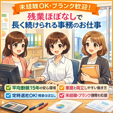 | 仕事内容 | +…・…*…・…*…・…*…・…*…・…+ 【お任せするお仕事】 社員が安心して働ける環境を支える、 バックオフィス中心の事務業務です。 【具体的には】 ・勤怠データ(タイムカード)の確認・管理 ・休暇申請のチェック、管理 ・各種資料の作成 ・入社・退職に関する手続き など 難しい作業や専門スキルは不要。 決まった業務の流れがあるため、 事務未経験の方やブランクがある方も安心して始められます。 +…・…*…・…*…・…*…・…*…・…+ 【こんな方におすすめ】 ・未経験から事務職に挑戦してみたい ・家庭や自分の時間を大切にしながら働きたい ・久しぶりの仕事復帰で、負担の少ない職場を探している ・安定した環境で、長く働き続けたい 【働き方について】 ・基本は定時退社 ・「もう少し収入を増やしたい」という方は 希望に応じて残業で調整することも可能です +…・…*…・…*…・…*…・…*…・…+ |