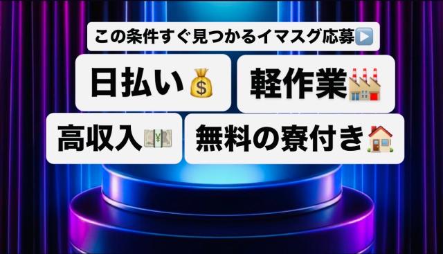 | 待遇 | ●福利厚生、待遇、職場環境 各種保険完備※加入必須 昇給制度、賞与制度 特別休暇※忌引き等 有休消化※100%可能 お給料前借り 日払い、週払い可 土日祝休み※一部希望シフト、希望休み可能 各大型連休連休有り※職場による 社宅、寮費有り※無料〜会社補助、完全有料まで 部屋のサイズ1R〜最大5LDKまで有り ペット寮有り※一部職場のみ 喫煙所有り/分煙 休憩所有り 大浴場、サウナ付き有り※一部職場のみ 無料ジム有り 図書室有り スマホ貸し出しサービス有り※職場による タトゥーの方、受け入れOK※規定、職場による |