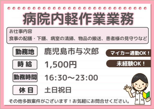 | 仕事内容 | 環境整備や雑務が多い、 ナースさんたちのサポート業務です! 初めての方でもできるお仕事です☆ ※介護業務なし!! 初めは出来ることから始めてもらいます♪ |