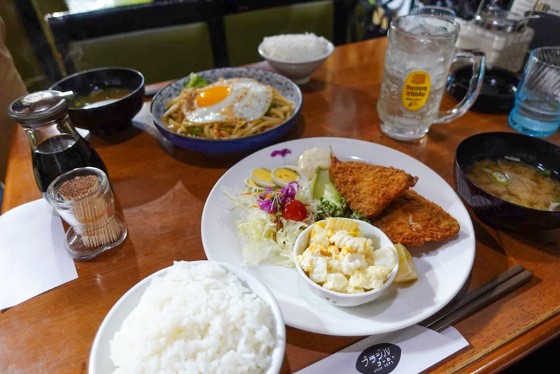 一日街を巡ったら、最後は「金山ブラジルコーヒー」で落ち着くのがおすすめ。ビールや、ブラジルコーヒー焼酎などお酒の種類も豊富だし、夜も定食メニューが注文できる。古賀さんがよく頼むのは「焼きうどん定食(目玉焼き付き)」と「アジフライ定食」、それに「カルダモン焼酎」。