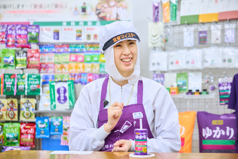 峠本さん:同じ商品名でも味付けの違う商品がいろいろとあります。たとえば「ゆかり」には減塩タイプがありますし、業務用と家庭用でも味付けが違うものがあります。それを間違って出荷してしまったら一大事なので、袋詰めする前には必ず原材料の味見をして確かめるというルールがあります。この役割を担っているのが「味覚マイスター」です。