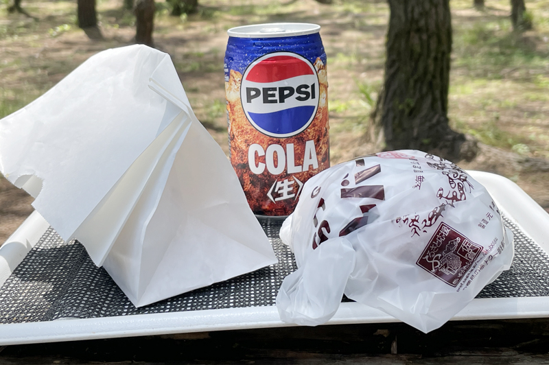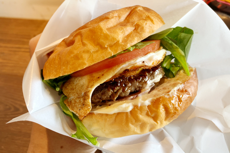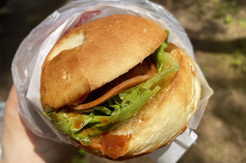 私はスペシャルバーガーというやつを食べました! パティのほかにチーズ・ハム・レタス・玉子が入っていて600円。ソースは甘めのバーベキュー風味で、外で食べるのにぴったりの味とボリュームです!