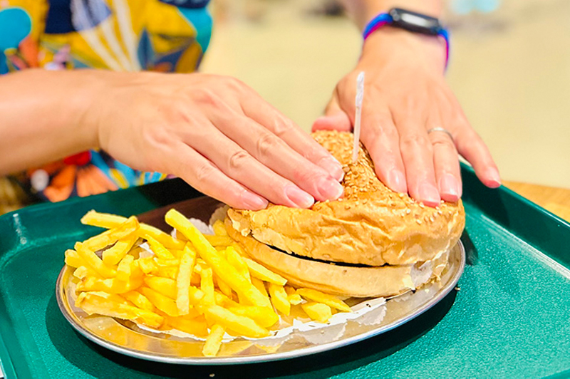 そしてハンバーガーと対峙。「これ、一口でどこまでいけるの……?」と不安になりますが……