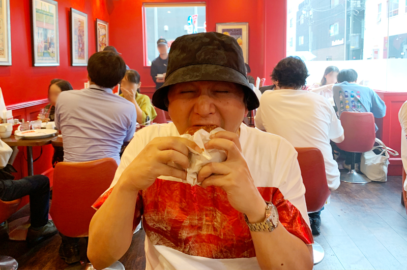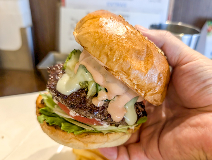 どこから食べても『超うまっ!!!!』の言葉しか出てこないのですが、真っ先にビビるのがステーキを食べた時のようにジューシーで荒々しい旨みが溢れ出てくるパティの美味しさで、はじめて食べた時は脳内が『?』となるほど強烈な衝撃を受けます。