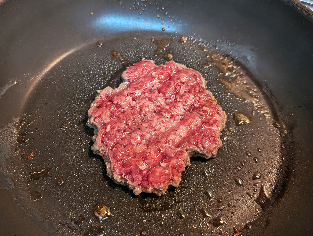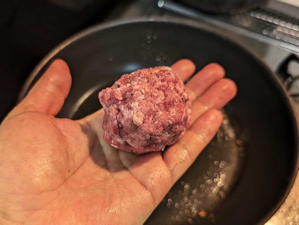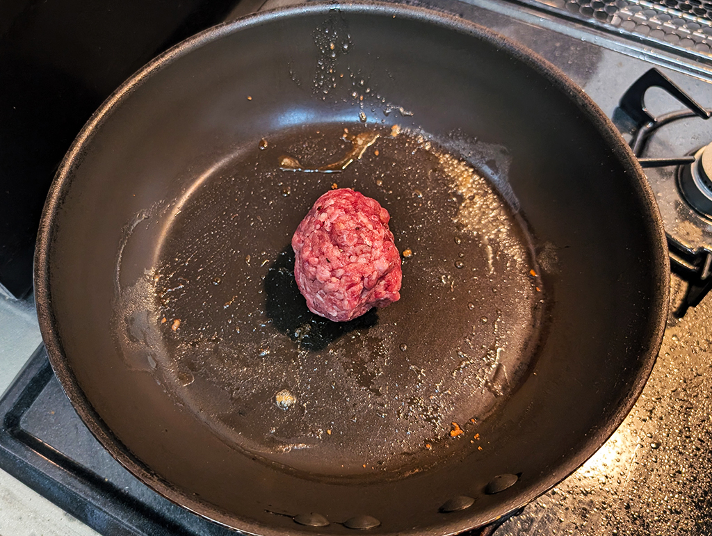 あと、スマッシュバーガーって家庭でもめちゃめちゃカンタンに美味しく作れるので、最近はむしろ家で食べることのが多いです。こんな感じで、牛のひき肉を丸くして塩コショウを振って…。