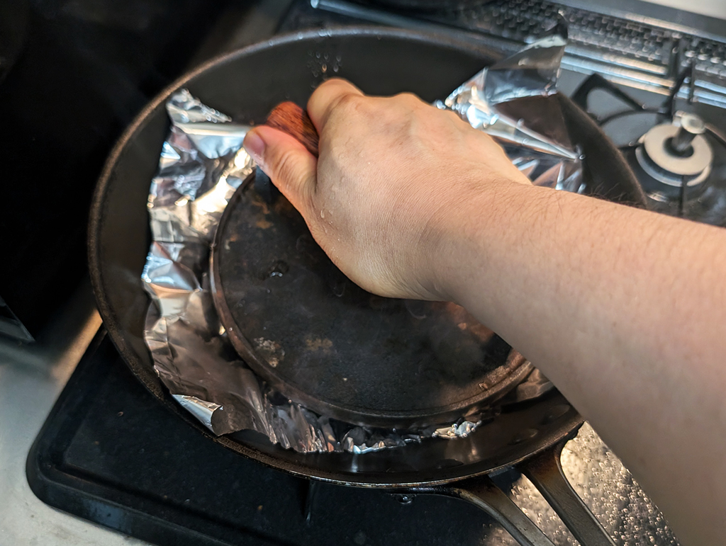 これだけで、肉の旨味が強くて香ばしいパティが焼きあがります! 上から押し付けるものは、小さな小鍋でも瓶でもなんでもOK。アルミホイルを敷けば汚れもしません!