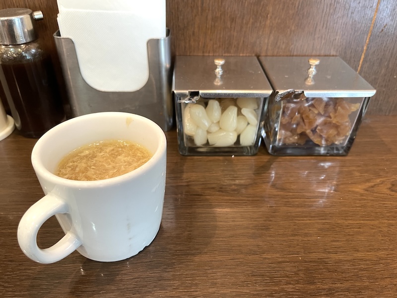 野菜の「旨み」、肉の「コク」、魚の「ダシ」が融合した秘伝醤油ダレに、追加で足した辛味とにんにくの旨みまで増された極上のスープ。