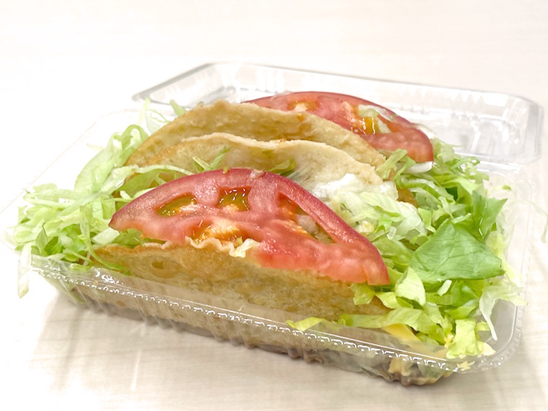 タコス(2個690円)の生地は揚げられており、パキッと割れるようなハードシェルタイプなのかと思いきや、厚みがあってモチモチした食感!