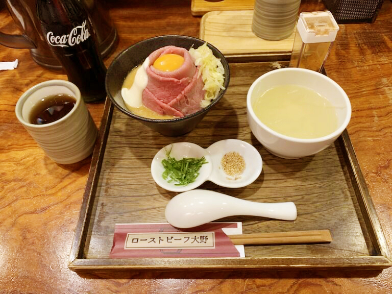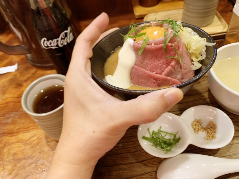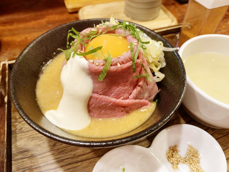 ローストビーフがご飯の上に山のような形で巻かれてて、それがふわとろでめちゃうめーです。牛肉の味がさっぱりしてて、食欲ない時でも余裕で食べれる!
