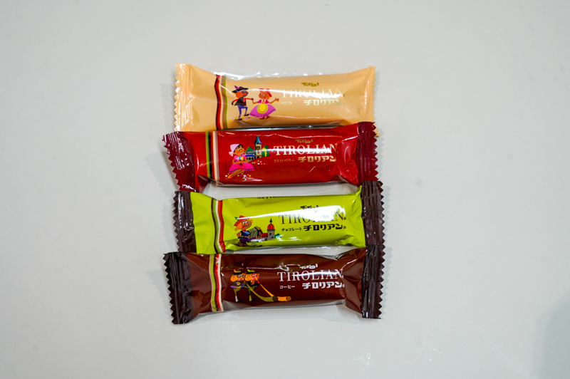 「チロリアン」。むか~しからあるお菓子ですね(1962年に誕生)。アソートパックなので色んな味が入ってます。