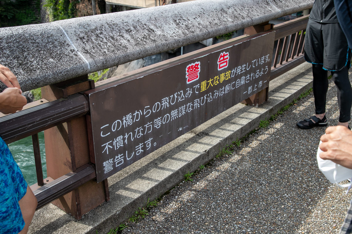 「昨日ユルさんが案内したと思いますが、郡上八幡の橋には、『不慣れな方の無謀な飛び込みは自粛を』と注意書きがあるんです」