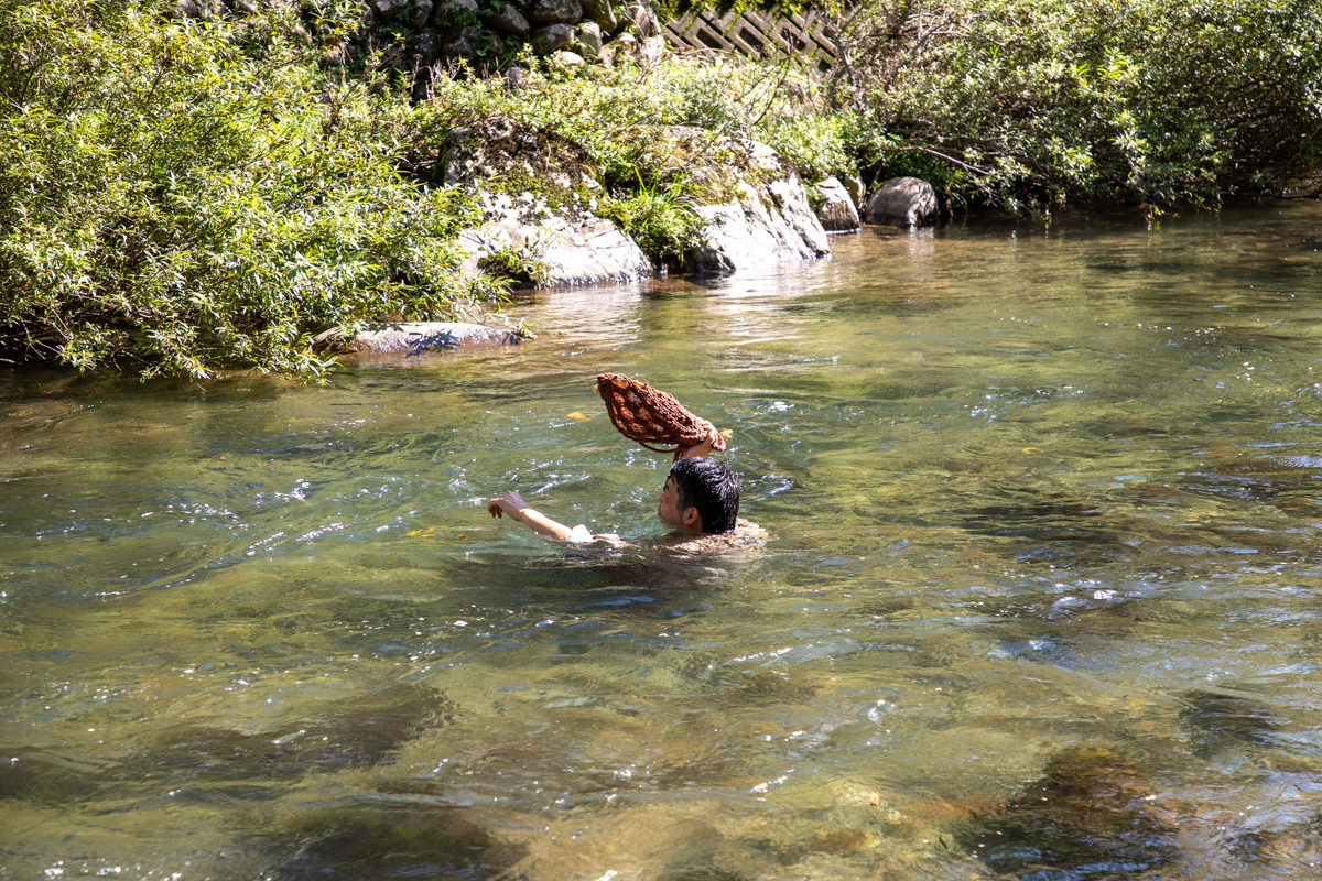 取材中も、おもむろに川へ飛び込む岡野さん。ちなみにホラ貝は山伏の方をツアーに招いた時、吹いている姿を見て「やりたい!」と思ったそう