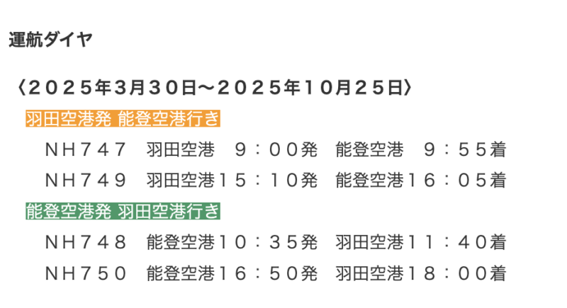 「のと里山空港」(以下、能登空港)と羽田空港間のフライトは現在、1日2往復。震災直後の2024年4月には1日1便で再開し、同年10月には2便になっていたようです。