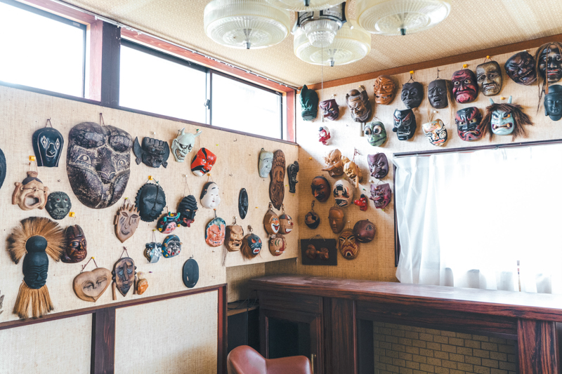 「ここ、元々は地元の校長先生のご自宅だったんです。立派な建物ですよね。仮面は船乗りの人たちからもらったお土産らしいです」